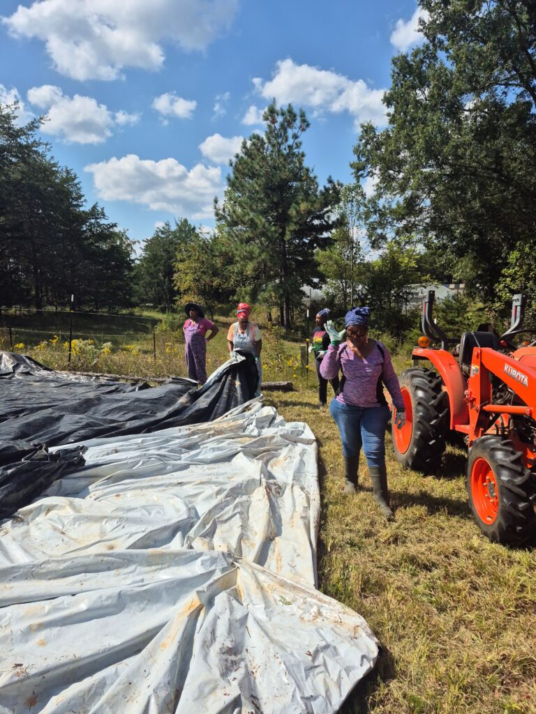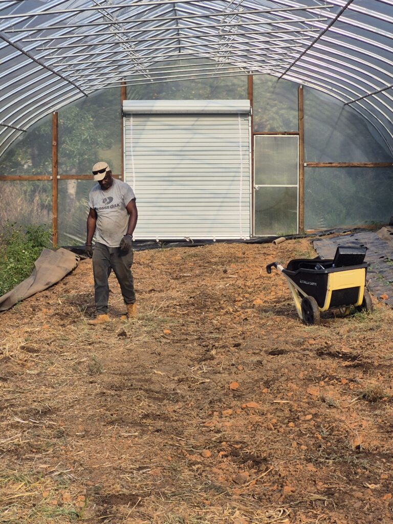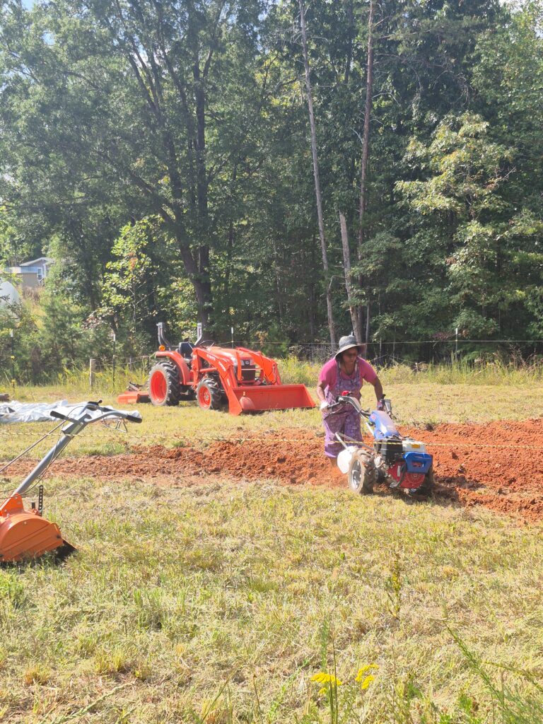 With a vision to create a “therapeutic safe space for Black women,” Stephanie has transformed her family farm into a thriving produce and herb operation, with glamping-quality quarters under construction to expand the MysticPine experience. This brigade was organized to give her a jump start on fall and next year’s planting season through bed preparation. In-ground beds were created both in the field and in one of the greenhouses. Because soil restoration is a high priority at MysticPine, soil amendments were purchased and discussed in depth.